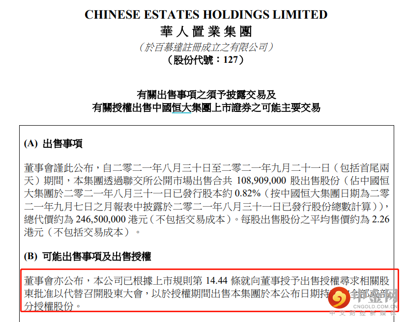 华人置业公告称,已向大股东寻求授权出售手持的全部或部分恒大股份,按恒大本周二收市价2.27港元计算,若全部出售其对恒大的持股,所得款项约17.05亿港元,并预计将亏损约95亿港元。