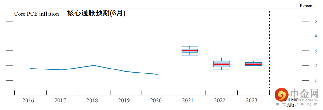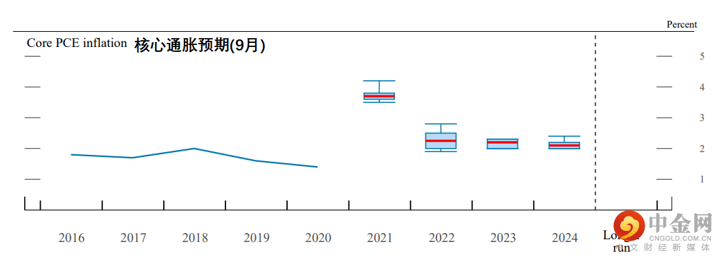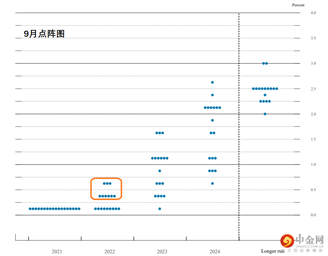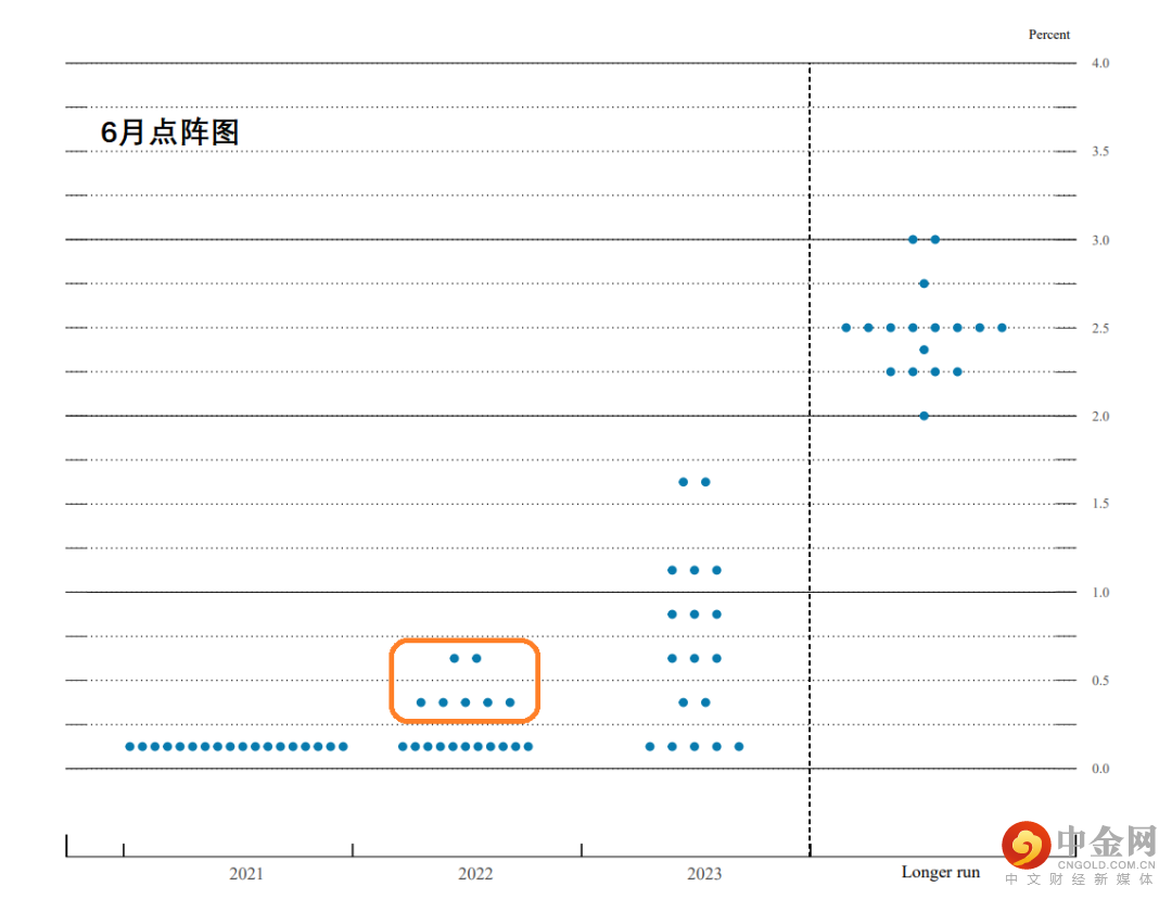 3)点阵图显示更多与会者预计2022年开始加息。此次更新的点阵图显示,至少一半的与会者(18位中的9位)预计2022年至少加息一次,而6月FOMC会议时这一数字是7人。