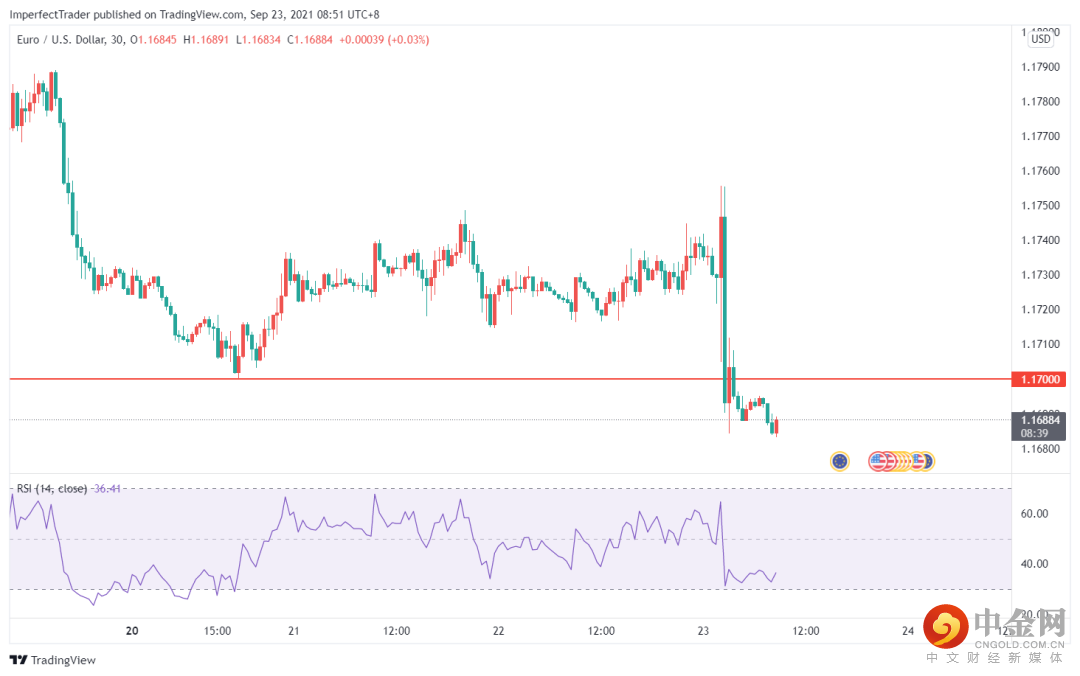 30分钟图中,欧美在会议过后的阴线几乎吞没了前期平台的所有K线,因此该平台的低点1.17000成为短期重要阻力,目前RSI指标读数较为温和。