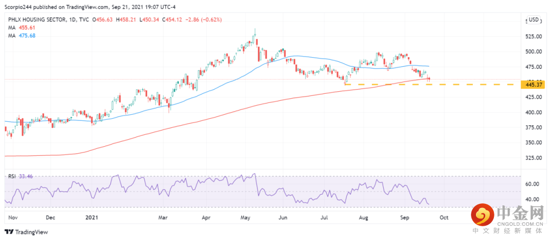 房地产板块的走势仍很糟糕,房地产指数接近触及7月低点。相对强弱指数RSI显示费城房地产指数基金尚未出现超卖,未来仍将出现进一步下跌。费城房地产指数基金的200日移动均线处于危险之中。