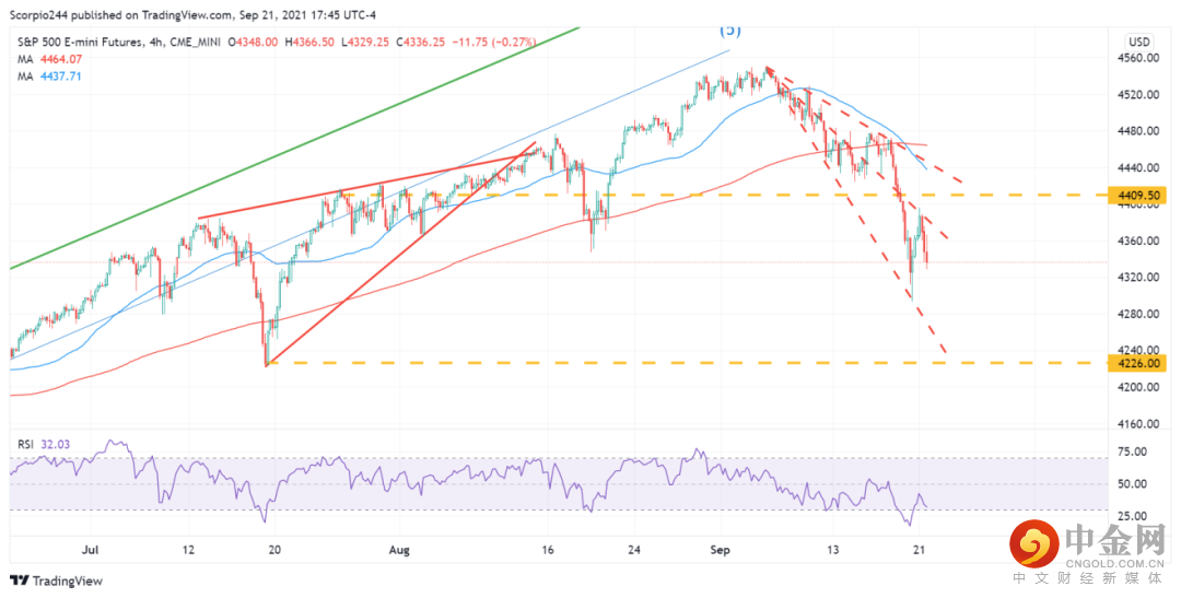 我尚未完全数清目前的模式。不过我相信这可能是第一个下行边的开始。趋势线看起来很强劲并且明确。趋势线的下一个支撑线水平位于4240点附近,与7月中旬的支撑线吻合。