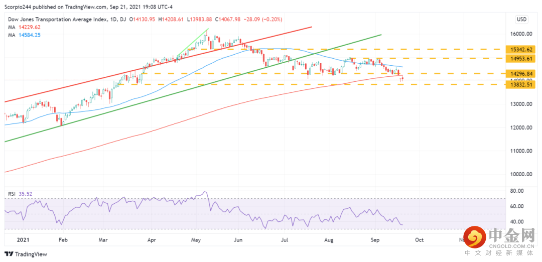 道琼斯运输业平均指数昨日跌破其200日移动均线,并且在今日再次下跌。图表走势看起来不妙。