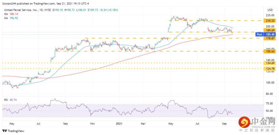 UPS快递今天下跌约2%。需填补的缺口在178美元处。