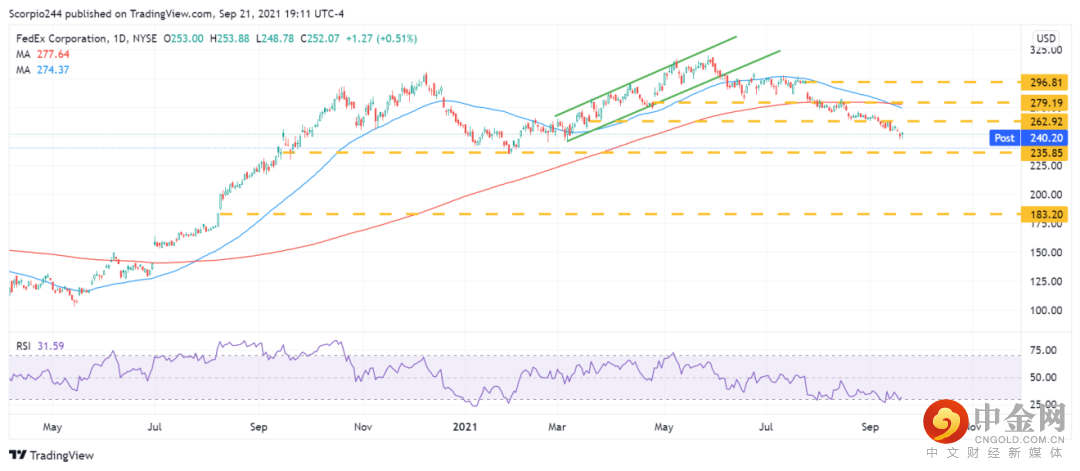 联邦快递的股价在盘后交易时段下跌了逾4%,并且在235美元处找到强支撑。联邦快递需要维系住这一支撑线,否则我们可能会看到填补183美元处的缺口。