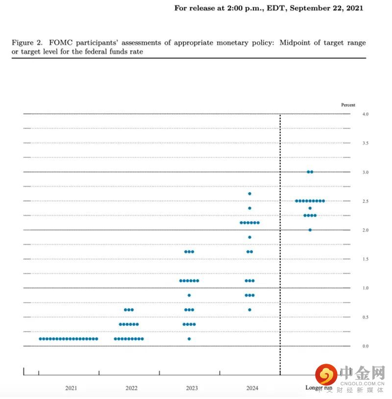 点阵图显示,所有美联储官员均预计今年利率将保持不变,与6月预期一致。不同的是,18名官员中有9名预计将在2022年底前至少加息一次,此前只有7名官员持有这一预期,大多数官员预计2023年加息。13名官员预计2023年将至少加息两次,9名官员预计2023年至少加息四次。