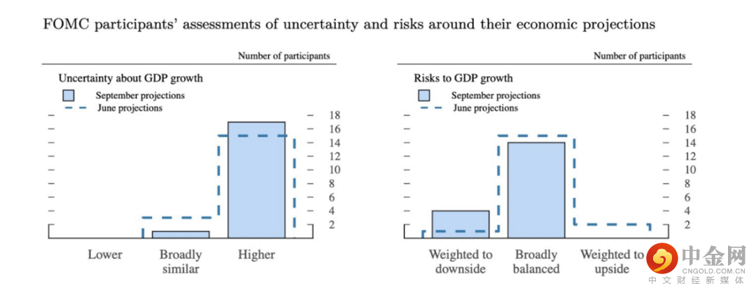 美联储经济预期中的图表显示,FOMC与会者中多数认为实际GDP面临较高的不确定性,风险大致平衡。
