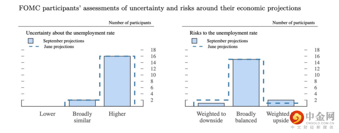 美联储经济预期中的图表显示,FOMC与会者中多数认为失业率面临较高的不确定性,风险大致平衡。