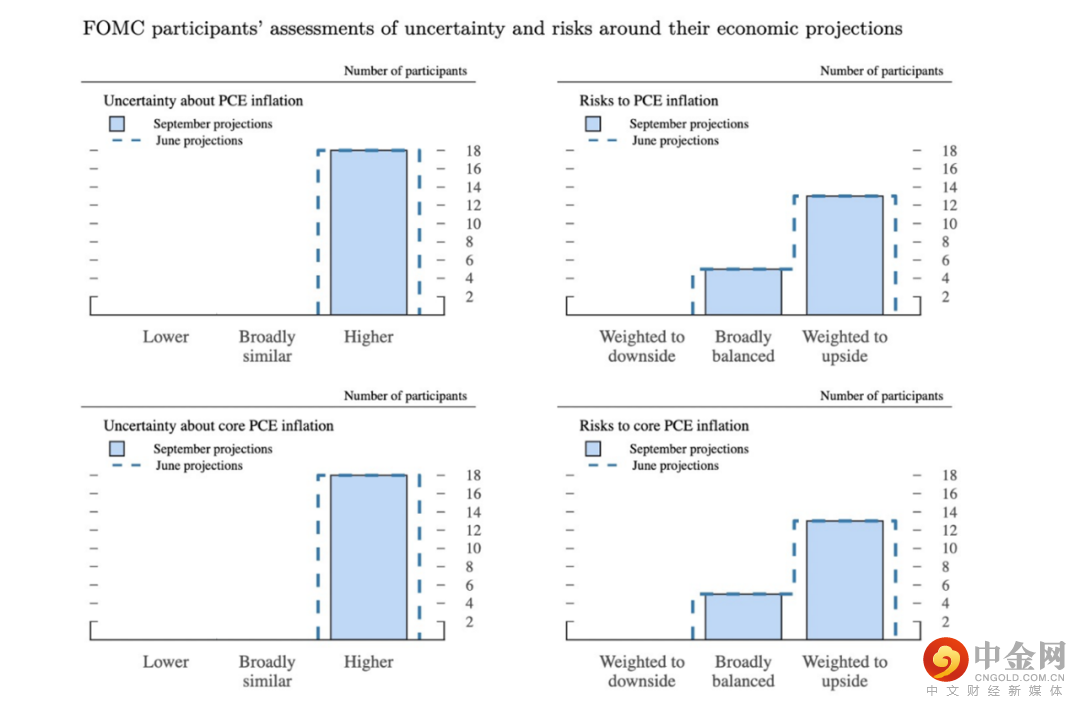 美联储经济预期中的图表显示,FOMC与会者中多数认为PCE通胀、核心PCE通胀面临较高的不确定性,风险倾向上行。