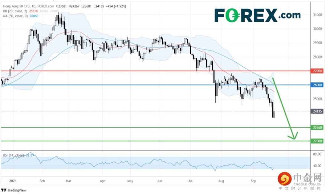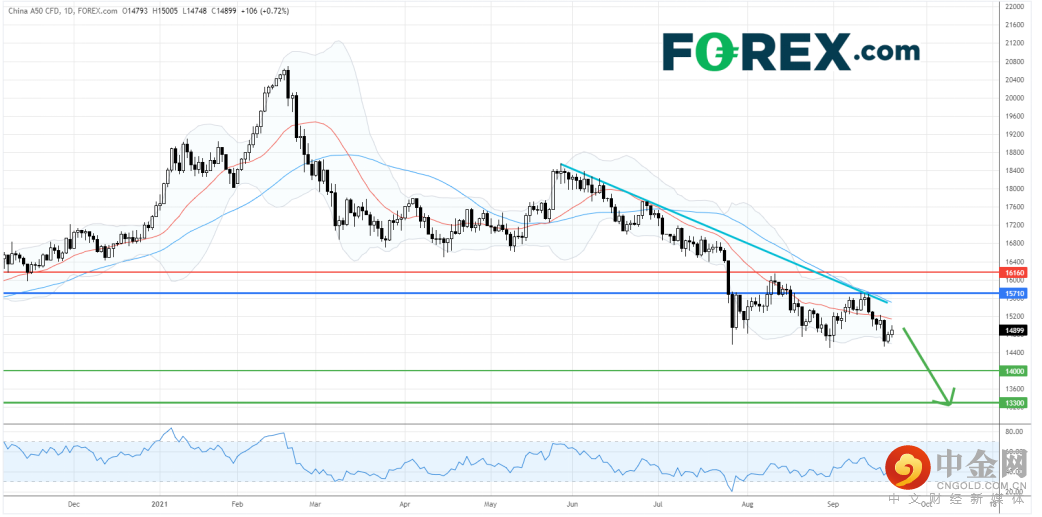 中国A50指数CFD近期仍在低位受压并再试8月低点,市场忧虑恒大地产(3333.HK)的债务危机逐渐升温,并使房地产和金融类的股票出现较大的抛售压力,而其他行业亦因市场信心受损而遭到减持。