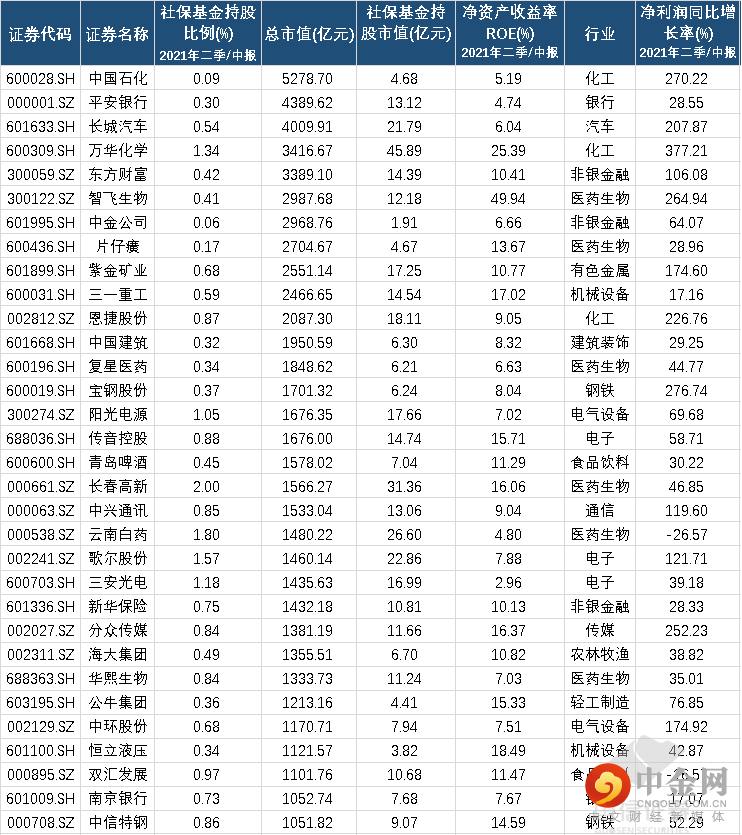 根据2021年中报披露的上市公司前十大股东,社保基金共持有432家A股上市公司,从中报时间节点来看,社保基金持股超过千亿市值的公司有32家,这32家大市值公司无论是ROE、还是业绩增长的基本面都相对扎实。