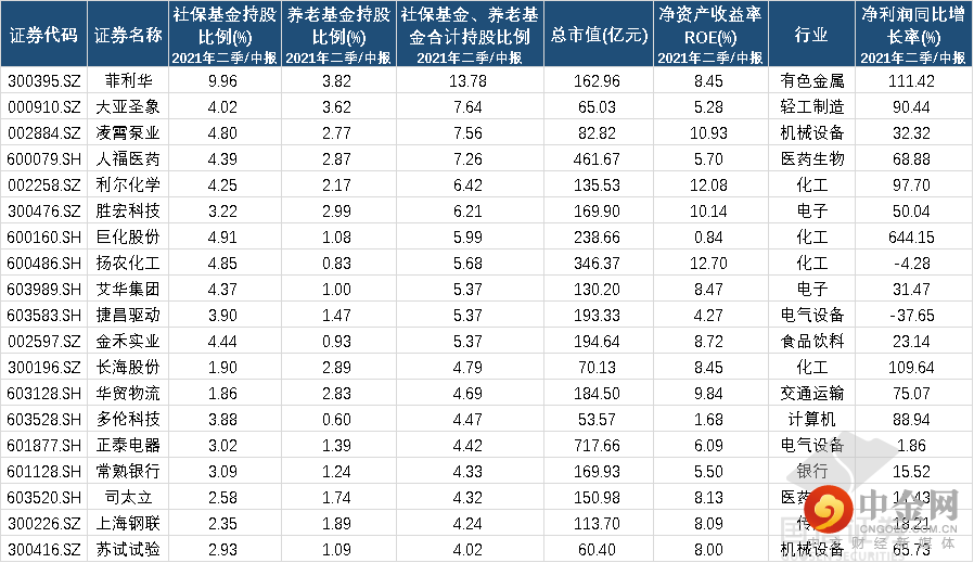 再看养老基金,根据上市公司中报统计,其持股家数和规模要小于社保基金,为128家,且持股市值相对少。其中养老基金、社保基金共同持股的上市公司共有63家,合计持股比例超过总股本4%的仅有19家,具体如下。