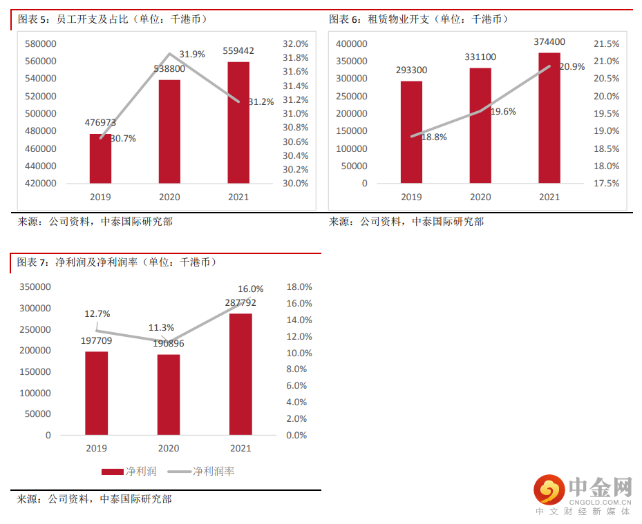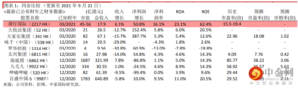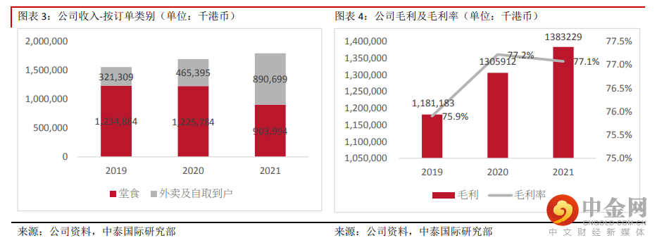财务分析:2019-2021 财年,公司实现收入分别为港币 15.6 亿元、16.9 亿元及 17.9 亿元,其中按品牌划分,谭仔和三哥分别各自贡献一半的收入比例,若按订单类别划分,堂食大概维持在 7-8 成比例,2021 财年受到疫情影响,外卖收入的占比增长至 5 成;每间餐厅每日收益分别为 4.1 万元、4 万元、3.7 万元;每餐厅日均顾客数分别为 77.2 万人、69.5 万人、64 万人;日均翻座率为 5.5 次、4.8 次、3.0 次;公司的毛利率分别为 75.9%、77.2%、77.1%;员工成本占总收入分别为 30.7%、31.9%、31.2%;租赁物业开支占总收入分别为 18.8%、19.6%、20.9%;净利润率分别为 12.7%,、 11.3%、16.1%;经营现金流为 5.4 亿元、5.7 亿元、7 亿元;年末现金及现金等价物为 3 亿元、3 亿元、4.6 亿元。