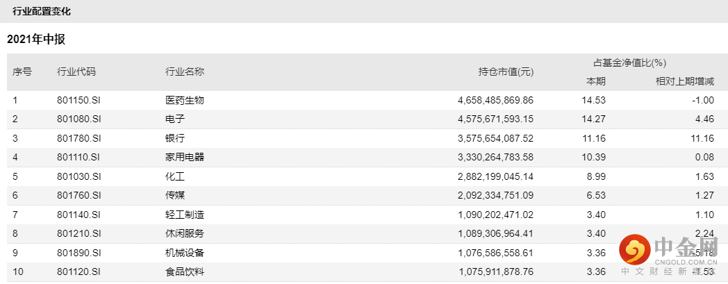 基金A的投资风格一贯偏向均衡,不赌赛道。从基金A最新披露的持仓情况可以看到,基金A延续了一贯的均衡风格,前五大重仓行业覆盖了消费(医药、家电)、成长(医药、电子)、金融(银行)、周期(化工)四大板块,各重仓行业配置比例在9%-14%之间。