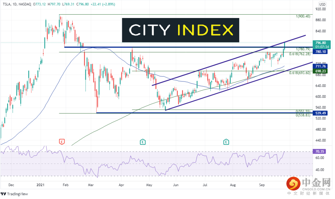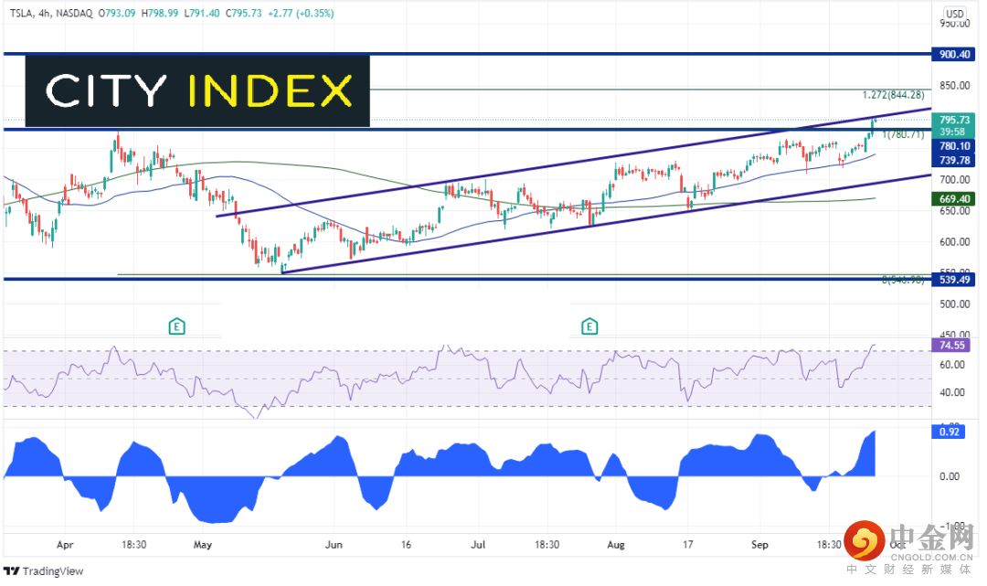 4小时图上,如果股价可以站上该趋势线兼心理整数关口阻力800,则下个阻力在4月14日高点到5月18日低点行情的127.2%延展位844.48和历史高点900.40。但若攻击失败,下档第一支撑位在780.71,接着是9月13日低点709.16,以及上升通道的下轨趋势线691.41。请注意,RSI目前处于超买区域,暗示特斯拉股价或许准备回调。