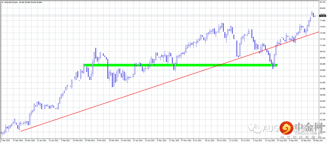 5) 路透9月28日 - 布兰特原油价格周二下跌,盘中近三年来首次突破每桶80美元,长达五天的涨势失去了动力,因投资者锁定获利。指标原油价格势如破竹,因燃料需求不断增长,且交易商预计主要产油国将在下周石油输出国组织(OPEC)会议上决定维持供应紧张状态。布兰特原油下跌0.44美元,至每桶79.09美元,跌幅0.6%,此前曾达到2018年10月以来的最高水平80.75美元。