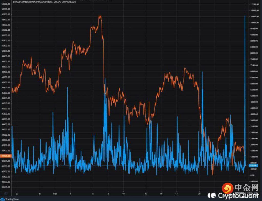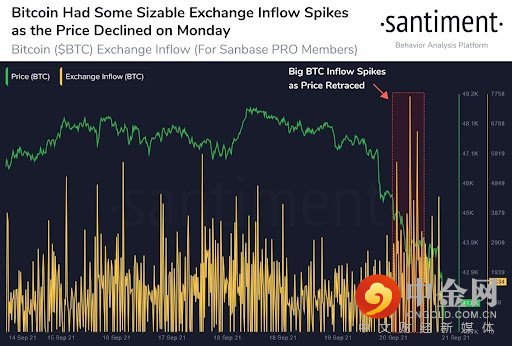 9 月 20 日,由于 BTC 的价格随着股价的下跌而暴跌,因此流入交易所的 BTC 出现了近期最大的峰值之一。