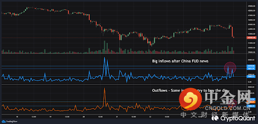 在周一晚上发生的最大跌幅期间,链上交易流入增加了 2,000 BTC,BTC 价格从 42,500 美元跌至 40,200 美元。然而,价格回升很快,因为价格在几分钟内回落至 42,000 美元以上。