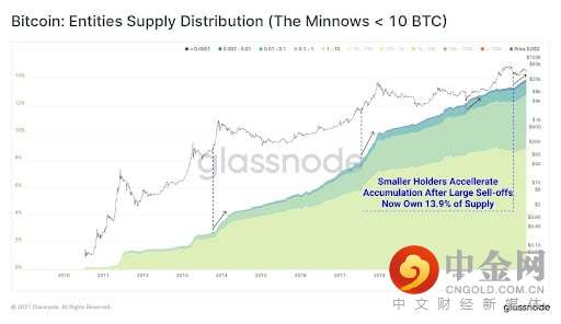 在下跌期间,注意到小买家在大肆蚕食比特币。由于价格下跌,上周少于 10 BTC 的小型持有者数量急剧增加,并继续以上涨趋势突破 ATH。这群 hodlers 现在占总供应量的近 14%,这是采用率增加和所有者分布扩大的好兆头,这有利于 BTC 的长期寿命。