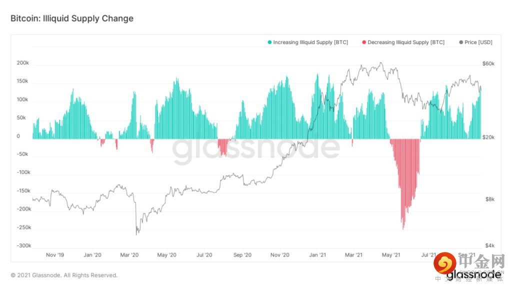 与杠杆零售交易者形成鲜明对比的是,BTC 的长期持有者对 FUD 和下跌并不担心,并继续增加他们的堆栈,如下图所示。在 5 月抛售之后,这些长期持有者自 9 月初抛售以来以更加激进的速度增持 BTC。