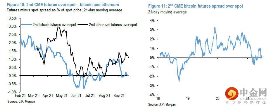 JPM 指出的一个有趣事实是,通过比较两种资产的期货与现货价格,市场参与者更看好 ETH,而不是 BTC。在看涨的市场中,由于通货膨胀和随着时间的推移对商品的需求增加,期货价格应该高于现货价格。JPM 指出,虽然 ETH 以期货价格高于现货价格的期货价格交易,但 BTC 期货的交易价格并不高于现货价格,这意味着投资者并不看好该资产。