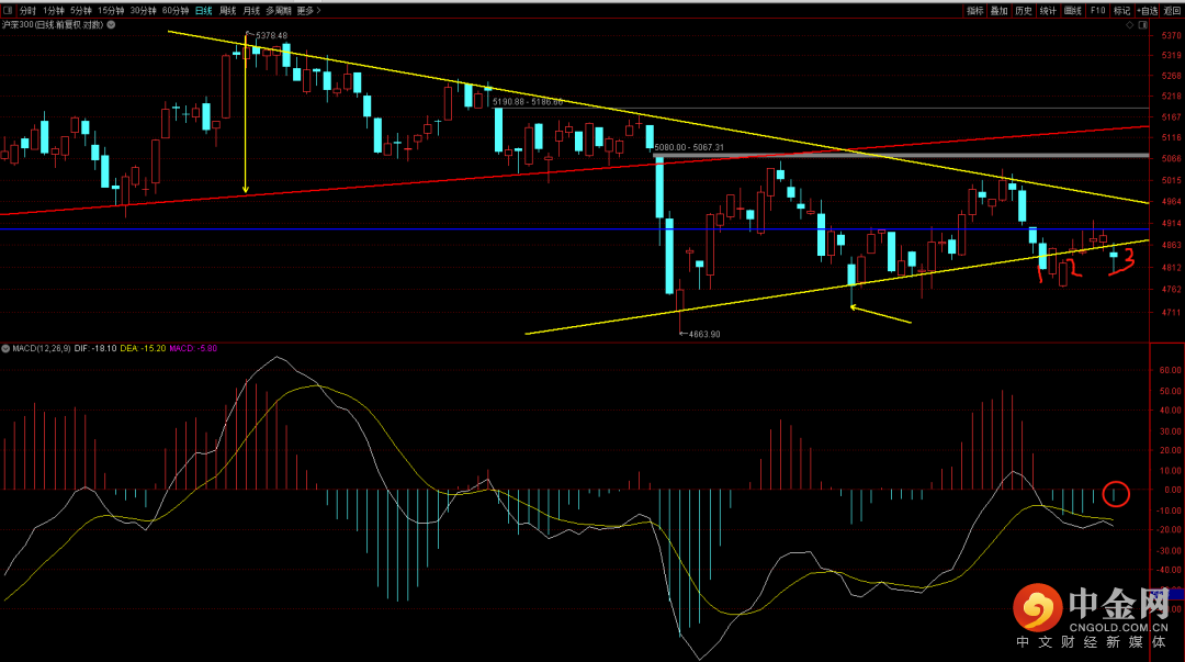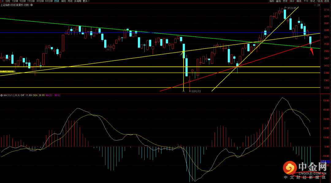 沪深300第三次出现跌破上升趋势线,由于macd量柱出现扩张,周四大概率会出现再次向下探周三的低点,关注是否会出现探底回升的走势,如果想要不跌破上升趋势线需要国庆后回来要出现大幅拉升才能避免。