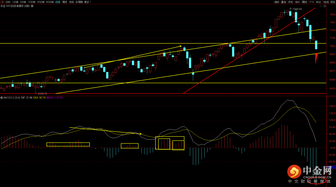 中证500跳空低开后向着前期上升趋势轨道下轨移动,短期大概率会再次向下,但下跌空间相对有限,这个位置大概率会出现一个反抽走势。关注后续反抽的力度如果不足够强则可能再次出现回落。