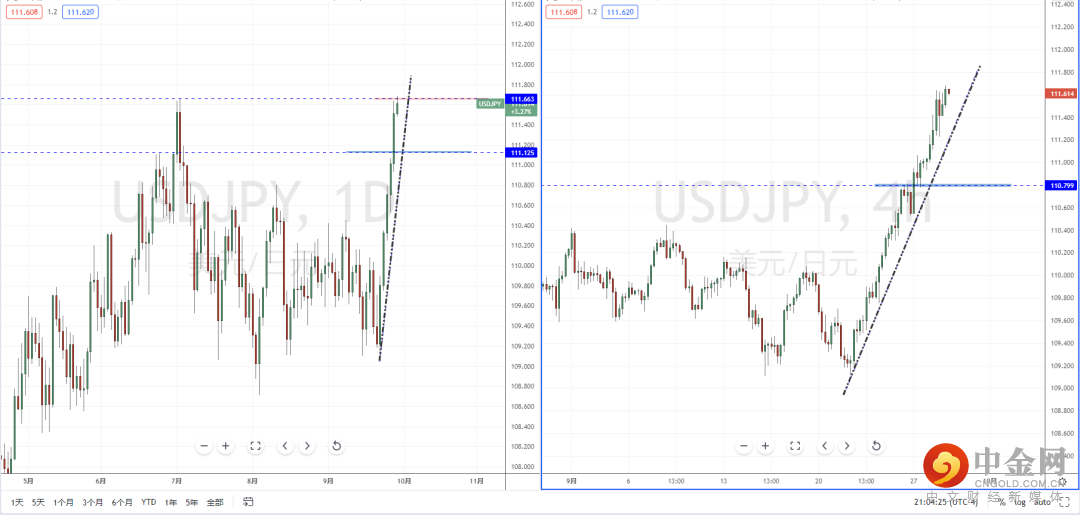 美日天图:目前趋势在持续单边上行之后,其价格已经触及上方关键压制区域111.663附近。虽然整体格局处于在多头方向,但短期不宜追多行情,趋势也尚未出现明显的调整状态。从日内4小时级别,可适当关注价格凭借上升趋势线的支撑作用,再次测试起稳向上的多头机会。