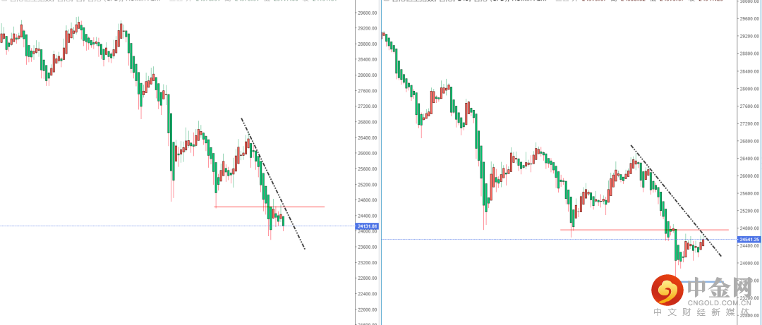 恒生指数天图:目前整体行情依旧在弱势空头阶段中徘徊,上方有下降趋势线的压制作用以及水平压制带在24526.01附近。从日内4小时级别,价格在相对低位徘徊后正处于测试关键压制节点附近。可适当关注价格在此区间的表现,如果受阻其趋势将继续走弱,目标位置参考前期低点附近。