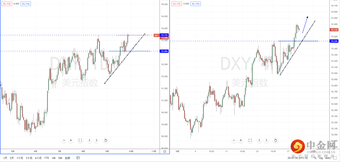 美元指数天图:短期价格继续冲击上方压制区域93.732附近,整体格局继续保持多头方向,与此同时其价格也处于在关键区域附近。如果坚决突破上行,将继续打开上方多头空间。从日内4小时级别,现阶段不宜追多行情。可适当关注价格调整后继续向上突破的多头机会,上方目标位置参考周线前期高点附近。