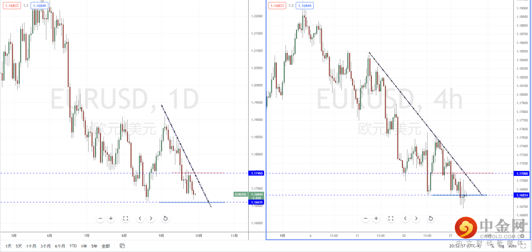 欧美天图:目前趋势继续保持空头方向,上方有下降趋势线的压制作用。由于短期美元处于在关键位置附近,欧美虽然在空头方向,但下方空间幅度有限,并且支撑带在1.16615附近。从日内4小时级别,价格也处于在此区间附近徘徊,可关注价格回测上方压制后再次走弱机会。