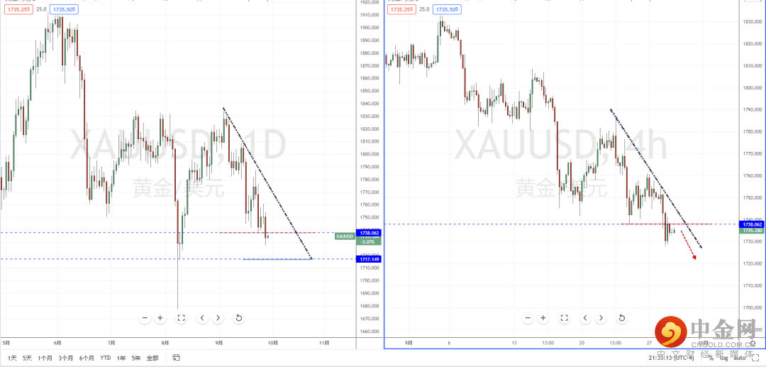 黄金天图:短期价格继续加速下行,并且有跌破水平支撑带1738.062一带。整体格局继续保持空头流向,上方有下降趋势线的压制作用。从日内4小时级别,价格在破位后进入调整,可关注价格回测上方压制后继续走弱的空头机会,下方目标位置参考1717.149附近。