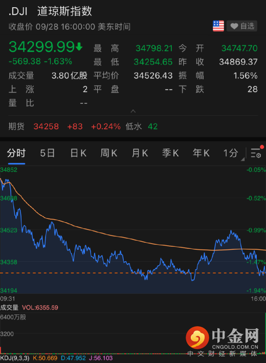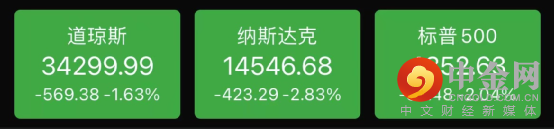 截至收盘,道琼斯指数跌1.63%,或569.38点,报34,299.99点;标普500指数跌2.04%,报4,352.63点;纳斯达克指数跌2.83%,报14,546.70点。