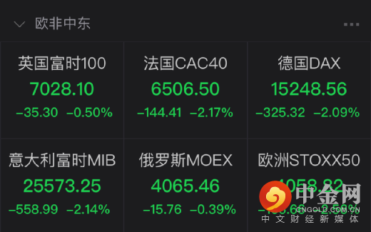 欧洲股市也一片惨绿,德国DAX指数跌2.09%报15248.56点,法国CAC40指数跌2.17%报6506.5点,英国富时100指数跌0.5%报7028.1点,意大利富时MIB指数跌2.14%报25573.25点。