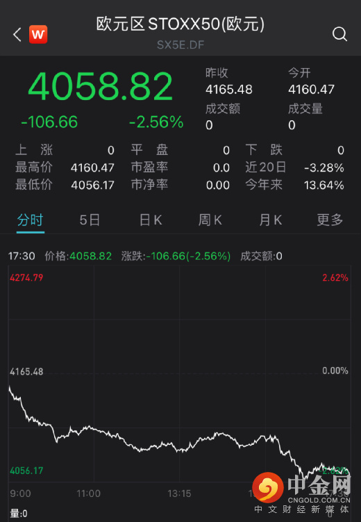 欧洲斯托克50指数也大跌2.56%。