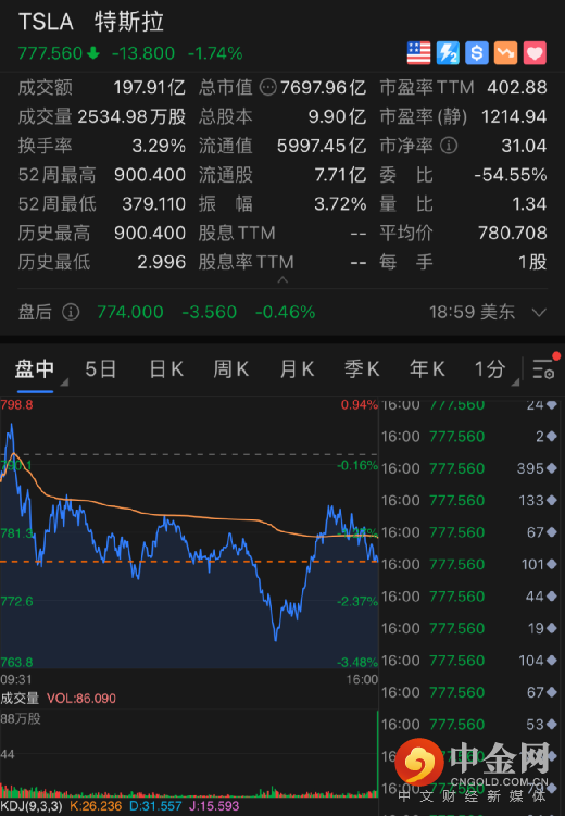 特斯拉跌1.74%,市值蒸发136.31亿美元,约合882亿人民币。