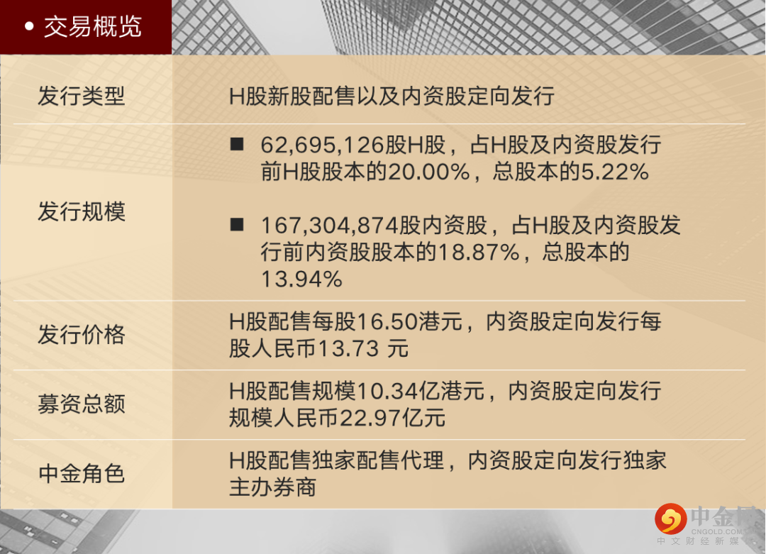 中金公司担任本次H股配售的独家配售代理和本次内资股定向发行的独家主办券商。