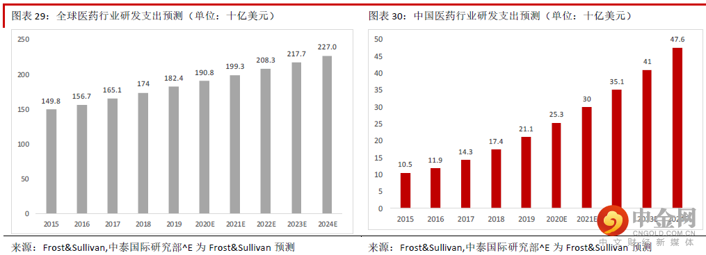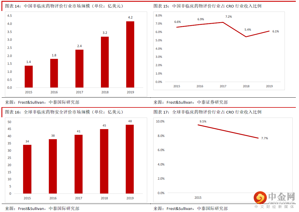 药物安全性评价是医药研发外包行业重要组成部分。公司主营业务非临床研发服务(占2020 年收入的 97.8%)主要包括药物安全性评价、药代动力学研究与临床试验服务,其中药物安全性评价是该板块的主要 业务,管理层表示约占该板块2020 年收入的70%。药物安全评价是指通过实验室研究和动物体外系统对治疗药物的安全性进行评估,是新药进入临床试验和 批准前的必要程序和重要步骤。由于很多中小型药企缺乏安评业务所需的GLP 实验室,药物安评行业的外 包率很高。根据美国行业龙头查尔斯河(CRL US)的资料,全球药物安评业务的外包率超55%。根据 Frost&Sullivan 报告,药物安全性评价是全球及中国医药研发外包行业(CRO)市场规模的6.1%及7.7%,是 CRO 行业的重要组成部分。近年来中国与全球非临床安全评价的需求快速增长。根据Frost&Sullivan 报告,该行业中国市场规模从2015 年的1.4 亿美元增加到2019 年的4.2 亿美元,2015-19 年CAGR 高达31.7%,全球市场规模从2015 年的34 亿美元增加到48 亿美元,2015-19 年CAGR 也达到9.4%。