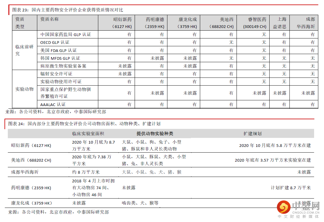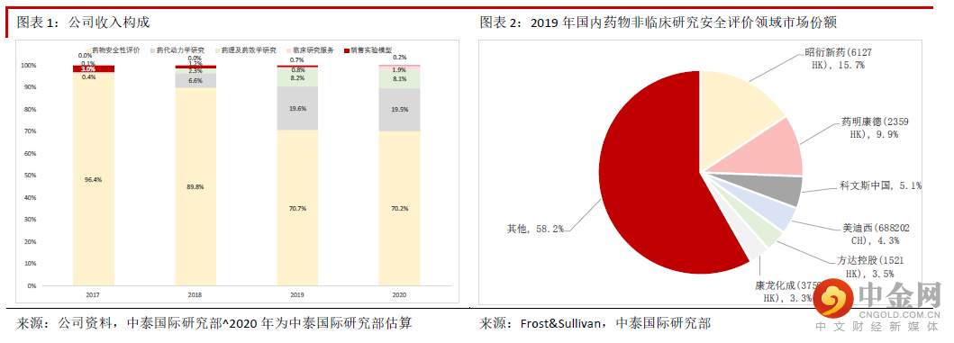 公司是国内药物安全评价行业龙头,根据Frost&Sullivan 报告,2019 年国内市场份额高达 15.7%,未来将继续受益于药物安评业务的外包需求,主要原因包括:1)药物安全评价 业务的外包率很高,将受益于新药研发的需求:很多中小型药企缺乏安评业务所需的符 合优良实验室规范(GLP)的实验室,因此安评外包的刚性需求很大。2)公司是国内少 数同时拥有中国、美国、经合组织(OECD)颁发的优良实验室规范(GLP 认证)的企业 之一,能满足全球客户需求。3)强大产能确保订单快速兑现:公司临床实验室面积处于 国内领先地位,实验动物种类齐全,强大产能确保订单迅速兑现。