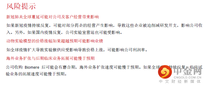 公司9 月21 日公布以83.97 人民币的授予价格向505 名业务骨干授予限制性股票,授予 价格较A 股前一个交易日收市价折让50%,我们认为大规模发行股权激励计划将提振管 理层积极性,长远看对公司发展有利。首次覆盖并给予“买入”评级,目标价131.48 港元 考虑到公司收购Biomere 后管理费用率略微上升,而且预计疫情舒缓后实验猴价格再大 幅上升的可能性不高,生物资产公允值收益将减少,预计2020-23E 股东净利润CAGR 为 36.7%,增速快于行业平均。目前股价对应53.6 倍2022E PER,低于港股行业平均的65.0 倍,估值有提升空间。目标价131.48 港元,对应64.5 倍2022E PER,给予“买入”评级。风险提示:(一)新冠肺炎全球蔓延可能对公司及客户带来影响;(二)动物实验模型 的价格涨幅如超预期可能影响业绩;(三)海外业务扩张与临床业务拓展可能慢于预期