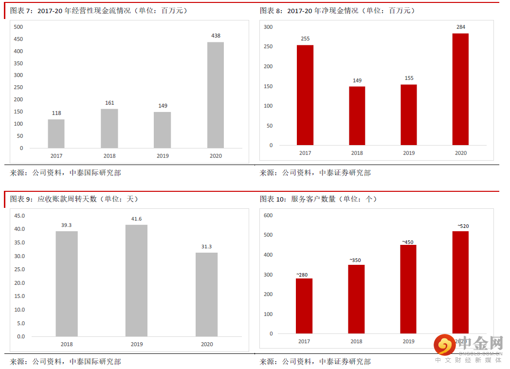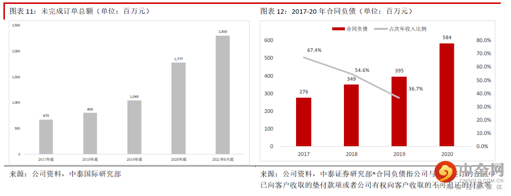 财务状况健康,未来业绩能见度高。公司过去几年财务状况良好,2020 年底银行借款金额仅约2,446 万元, 2018-20 年净现金金额持续快速增长,2020 年应收账款周转天数在缩短,经营性现金流大幅增加,表明公 司在疫情期间客户回款情况很好,财务状况健康。通常来说,我们可以用客户数量、在手订单数量变化、新增订单的情况及合同负债等先行指标预判公司的 业绩。公司客户数量从2017 年的约280 个增加到2020 年底的约520 个。公司未完成订单总额从2017 年的 约6.7 亿元增加到2021 年6 月底的约23 亿元。公司获取订单的能力越来越强,2021 年上半年新获订单约 13 亿元,接近2020 年全年的约17 亿元。我们估计2020 年获取的订单多数将在2021 年确认收入,而21 年 新获得的订单多数也将在1~2 年内完成,因此业绩能见度很高。公司的合同负债近年也快速增长,表明短 期内业绩增长性能见度很高。