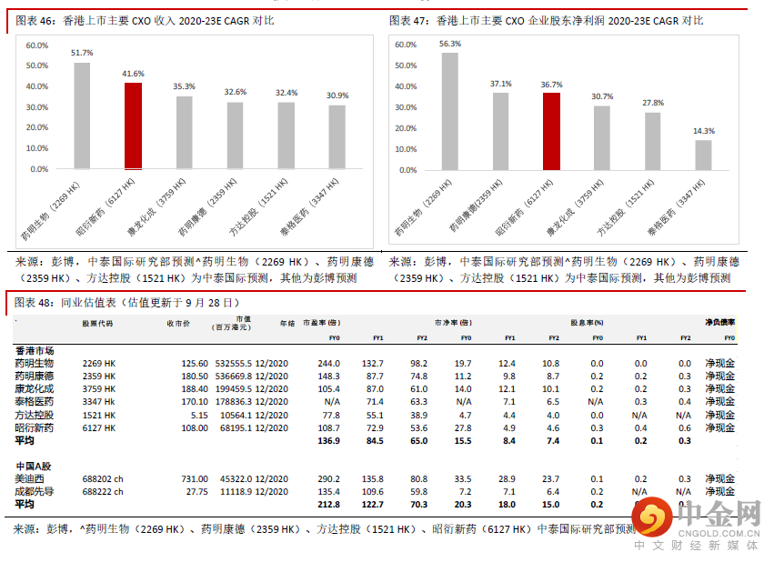 考虑到港股医药生产与外包服务行业(CXO)行业在香港市场标的已经较多,而且公司业绩前瞻性很强, 现金流稳定,我们用DCF 模型做交叉检测,平均得出131.48 港元的目标价,给予“买入”评级。相对估值法估值我们选取港股医药研发与生产外包服务(CXO)板块的药明生物(2269 HK)、药明康德(2359 HK)、泰格 医药(3347 HK)、康龙化成(3759 HK)、方达控股(1521 HK)做比较,同时也参考A 股中与公司同样主 要从事临床前研发服务企业美迪西(688202 CH)、成都先导(688222 CH)的情况,A 股公司中美迪西在 2019 年国内药物安评领域排名第四(见图表2),是公司主要竞争对手之一。公司目前股价对应53.6 倍2022E PER,显著低于香港上市同业平均的66.4 倍,较A 股主要竞争对手折让更 大。公司与药明生物(2269 HK)、药明康德(2359 HK)、康龙化成(3759 HK)等提供一站式服务的龙头 企业相比,目前业务主要集中于药物安评这个板块,高毛利的后期临床业务与商业生产业务还有待扩充, 但是药物安评是研发外包服务中外包率最高的板块,因此市场需求非常大,而且公司是国内这个板块绝对 龙头,而且产业链在不断扩充,因此收入与股东净利润均将维持快速增长。我们预计公司2020-23E 股东净 利润的CAGR 为36.7%,快于行业平均的33.7%,我们认为公司估值有提升空间,按照相对估值法估值,用 66 倍2022E PER 估值,得出133.0 港元目标价
