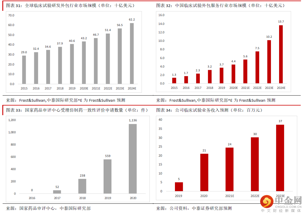 临床试验服务能力将逐步提升,一站式服务能力将不断提升公司近年开始发展临床试验领域的研发外包服务,目前主要是Ⅰ期临床与生物等效性分析为主,目前处于 起步阶段,但是近年来收入快速增长,2021 年上半年收入同比增长200.8%至约814.9 万元,我们预计未来 将快速发展,公司一站式服务能力将随之不断提升,主要原因包括:1)Ⅰ期临床试验外包服务的需求将 快速增长:优质改良型新药与创新药的需求不断提升,但是部分中小型药企缺乏临床试验的设施与科学家 资源,而CRO 行业龙头又能保证优质服务,因此临床试验的外包服务需求空间广阔。根据Frost&Sullivan 统 计,全球与中国临床试验研发外包服务市场规模的2015-19 年CAGR 分别为8.7%与29.3%,预计未来这种情 况将持续。公司目前主要从事的Ⅰ期临床是临床试验的起始部分,美国塔夫茨药物开发研究中心的论文表 明,Ⅰ期临床的费用约占临床试验总成本的22.2%,医药研发总投入的扩大必然带动Ⅰ期临床需求的增长。通常来说早期临床试验( I 期和II 期) 的外包比例较高。根据全球著名医学统计刊物PAREXEL Biopharmaceutical R&D Statistical Sourcebook(2016/17 年版)的统计,早期临床试验的外包比例为高达约 60%,因此预计随着全球创新药研发支出的增加,I 期临床试验外包的需求将快速增长。2)由于仿制药一 致性评价的推进,中国市场生物等效性研究需求空间很大。早年的中国市场由于本土药企研发能力有限, 以仿制药为主,而由于部分企业急功近利,在研发方面的投入远远少于销售推广,因此部分仿制药的疗效 与原研药差别很大。中国政府为了提升国产药物质量,2015 年起要求药企对临床试验开展自查核查工作, 为了提升仿制药品质,近年不断推进仿制药一致性评价。除此以外,政府持续推进药品带量采购,而进集 采名单的重要条件之一就是要通过一致性评价,如果不通过将无法入选,也无法获得政府的承诺采购量, 因此一致性评价的需求将持续增长。3)公司临床试验的产能在提升:公司目前总共拥有三个临床试验中 心,其中苏州太仓第一人民医院的1 期临床中心2021 年上半年投产,我们预计随着新临床中心的投产,公 司在临床试验方面承接订单的能力将持续增加,一站式服务能力将不断提升。4)订单数量将不断增加:公司通过主营业务药物安全评价业务,在CRO 领域已经建立起很好的品牌知名度。随着临床试验领域的产 能提升,我们预计将有更多的企业选择公司做临床试验阶段的研发服务提供商。公司2021 年上半年临床试 验阶段的订单金额同比增长超150%至约4,000 万元,表明公司服务的市场认可度在提升,未来这种态势将 持续。5)晚期临床业务将逐渐起步:公司的Ⅰ期临床项目将逐步向Ⅱ~Ⅲ期推进,而且随着公司在临床 试验外包服务领域的知名度不断提升,预计将有更多药企选择公司作为晚期临床试验服务提供商,这块业 务将逐渐起步。