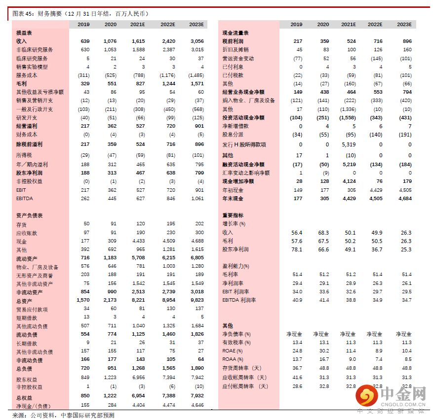 我们预计公司2020年获得的约17亿元订单中的大部分将于2021年完成。公司2021年上半年已经获得约13亿元订单,保守预计全年将获得23亿元订单,其中多数将在一年内年内完成。考虑到中国及全球市场新药研发的需求,我们预计2022-23年订单总额也将维持快速增长,因此预计2020-23E收入CAGR为41.6%。
