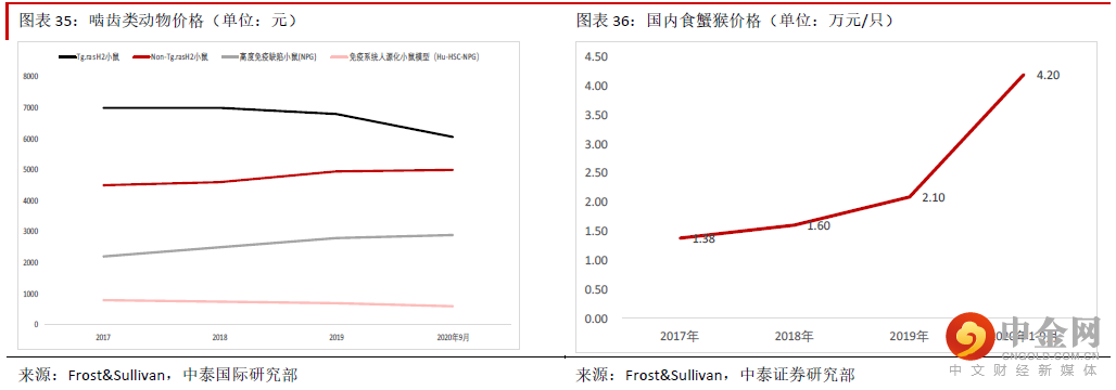公司的服务成本主要包括直接劳工成本、物资成本(耗材与实验模型)与间接成本(折旧与摊销及水电费 等)及生物资产公平值变动调整的影响,其中物资成本占比最大,分别占2017-19 年服务成本的50.4%、 44.5%、45.3%,是影响公司毛利率的主要因素。公司的实验模型主要包括非人灵长类动物与啮齿类动物。通常来说,由于啮齿类动物(大鼠、小鼠、比格犬等)繁殖周期较短,因此供应较为充足,价格稳定有些 还下降,但是与人类同源性较强的灵长类动物价格却在上涨。由于人类过度使用自然资源,而且灵长类动 物繁殖期较长,2020 年后新冠疫情对于灵长类动物的繁殖生长也造成影响,因此供不应求情况明显。根据 Frost&Sullivan 报告,常用非人灵长类实验动物食蟹猴的均价已经从2017 年的每只约1.38 万元上涨到2020 年1-9 月的每只约4.2 万元,这些情况导致公司的毛利率2018 年以后有所下降。为了增加动物实验模型的 自给率,公司从2019 年11 月开始在广西梧州建设动物基地,截止2021 年6 月底,基地的主体工程已经竣 工,今后仅需进行装饰装修及室外工程等。管理层表示由于疫情原因投入使用略需时间,但是投入使用后 能饲养约1 万头非人灵长类动物。我们认为长远看,提升非人灵长类动物的自给率有助于控制成本。