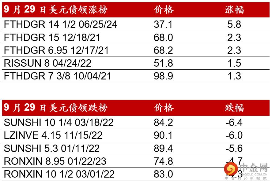 昨日(9月29日),融创未能延续前日上涨,基本已回吐前日债券回购消息所带来的涨幅,全日收跌约2-4pts。在花样年控股物业子公司彩生活出售邻里乐控股全部股权予碧桂园服务的消息推动下,花样年21年12月到期债券高开10pts,但随后有消息传出公司未按时支付私募债本金,涨幅因此在午前迅速回落,标普在下午下调花样年评级至CCC负面展望,但21年到期债全日仍收涨5pts。由于临近国庆长假市场整体买盘较少且流动性不佳,阳光城/融信下挫3-5pts,而其他地产债券如龙光/佳兆业/碧桂园等下跌约1-1.5pts。富力昨晚宣布与大股东成立合资公司,并获得大股东不超过104亿人民币支持,富力小幅高开1-2pts。