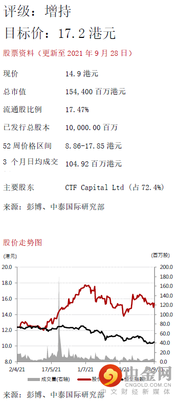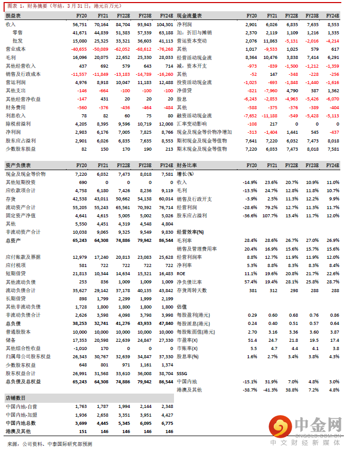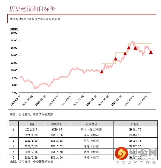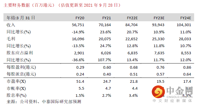 香港与内地通关是时间仍难以预计,但将是推动港、澳业务增长的催化剂,而中长期中国内地中产阶级数目的增长亦有利推动黄金珠宝行业发展,我们预测FY22-FY24总收入为847.0/939.4/1043.0亿港元,预测FY22-FY24的EPS分别为0.68/0.76/0.86港元,同比+13.4%/+11.7%/+12.0%%,维持17.2港元的目标价及“增持”评级,对应FY23 22.5倍PE。