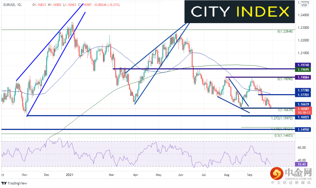 鉴于欧元在美元指数中拥有57%的权重,随着美元指数上涨,欧元/美元下跌也在意料之中。该货币对今天攻克了8月20日以来低点1.1664,在1.1656创下年内新低。如果继续下跌,下档支撑位在由2020年11月4日低点、8月20日低点到9月3日高点行情的127.2%扩展位构成的支撑带,即1.1597-1.1602区间,然后是2020年3月以来水平支撑位1.1495。日图上档阻力位在水平阻力位和50天均线构成的阻力带,即1.1770-1.1778,然后是9月3日高点以来的长期上升趋势线,即1.1908。