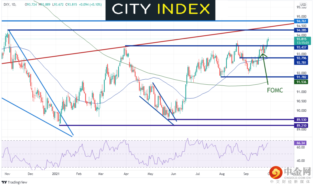 美元指数周四收在2021年最高点,创下2020年11月初以来新高。美元指数在1月初于89.20形成2021年低点,之后在3月31日涨至93.44高点。美元指数随后回落并尝试回踩1月低点,最终到达89.53,期间构筑(看涨)下降楔形,而现已向上突破该形态。美元指数在8月20日创下年内新高,今天于93.89再度创下年内新高,而且看起来上行空间广阔。下个阻力在遥远的2020年11月高点94.285,然后是2011年4月以来上升趋势线所在的94.40附近,接着是2020年9月以来高点94.74。