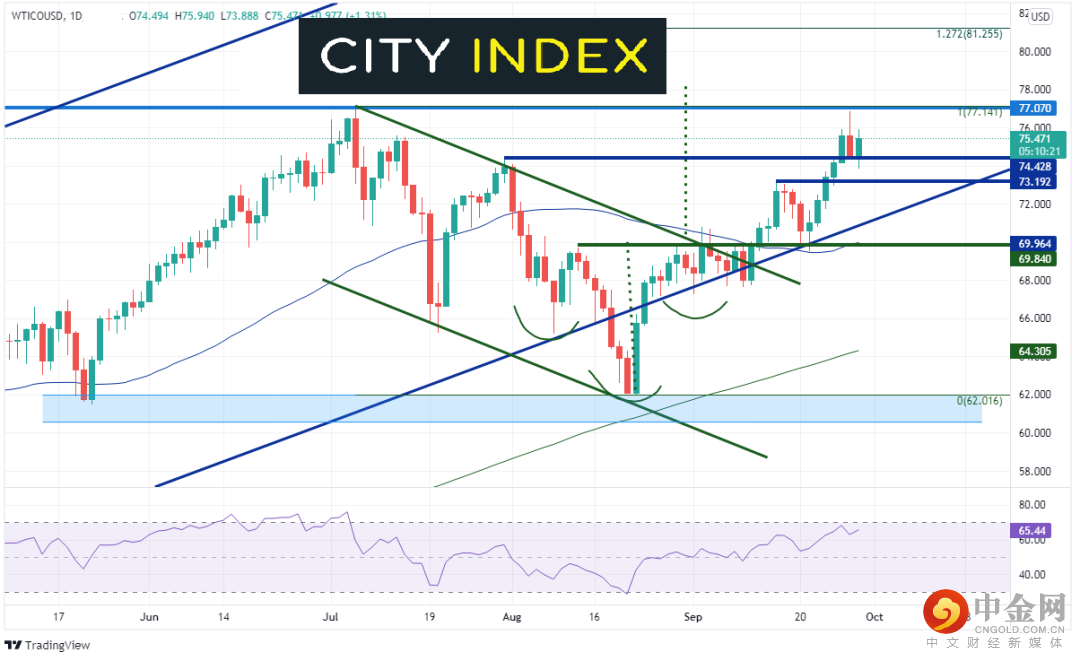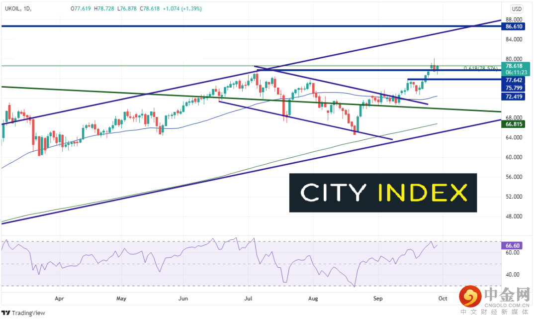 上周我们在讨论英国汽油供应短缺时注意到布伦特原油正逼近2014年10月高点到4月23日低点行情的61.8%回档位,即78.57附近,周二攻克该位并创下年内新高,但当天回撤,形成潜在的单根外包反转K线。英国原油周三徘徊于7月6日以来高点77.64附近,如果可以站上周三高点80.06,有望摸至2018年10月高点86.61附近。下档支撑位目前在水平支撑位75.80和50天均线72.41。
