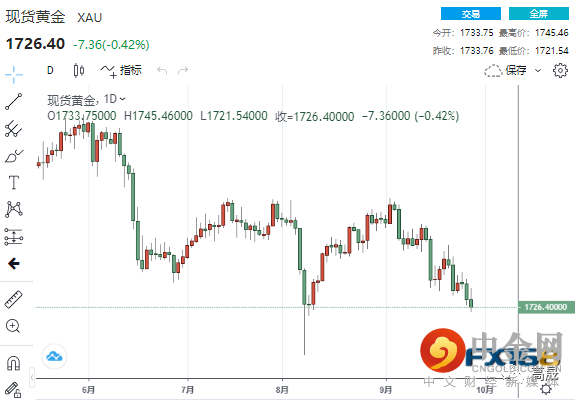 美市尾盘,现货黄金收报1726.40美元/盎司,下跌7.36美元或0.42%,最低触及1721.54美元/盎司,为8月10日以来的最低水平,较日高1745.56美元/盎司回落近24美元。